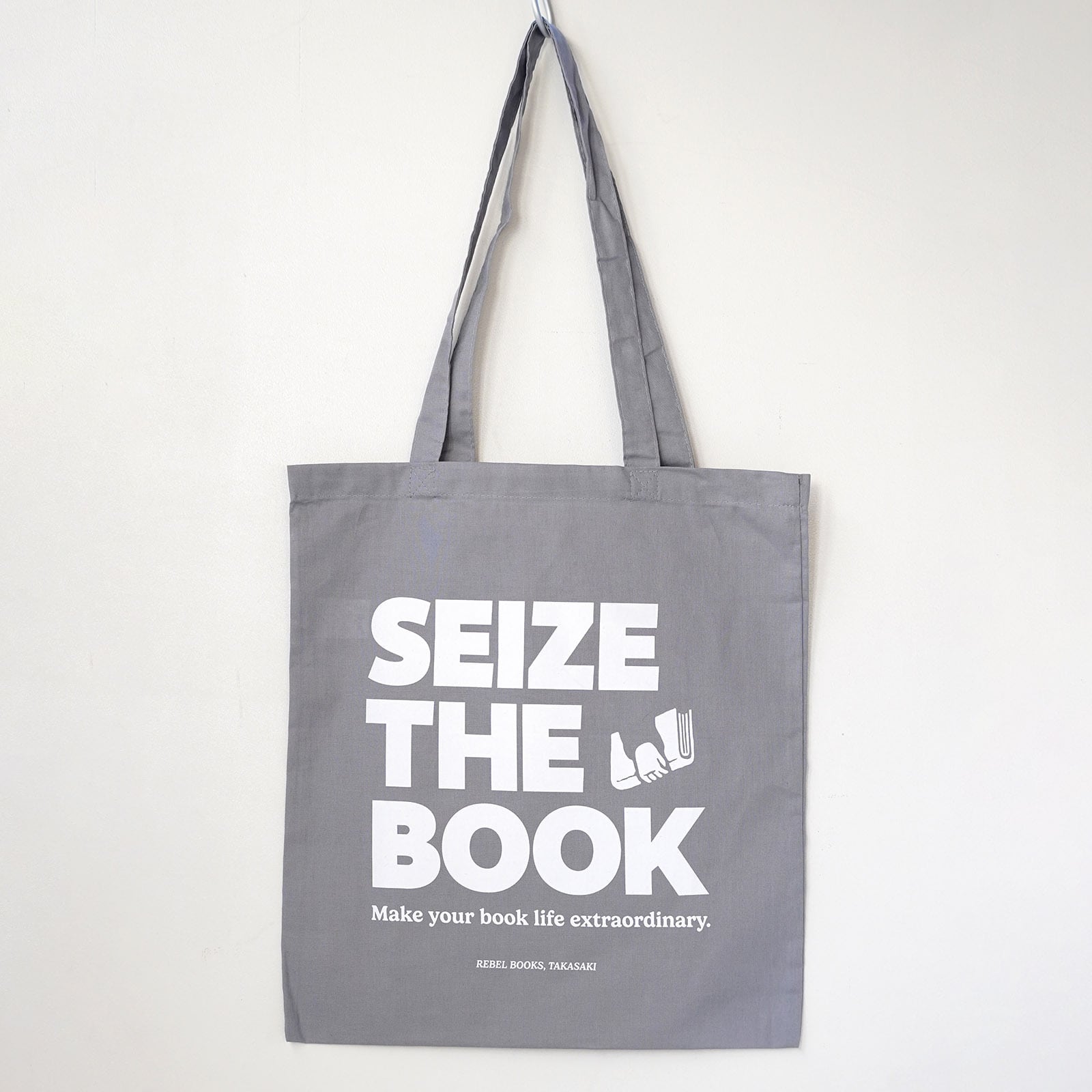 レベルブックスオリジナルトートバッグ。“SEIZE THE BOOK Make your book life extraordinary.”は「本をつかみとれ、あるいは目一杯楽しもう。そして本と歩む人生を素晴らしいものにしよう」というような意味です。レベルブックスのロゴイラストの参照元でもある映画『いまを生きる』の名セリフのオマージュです。
