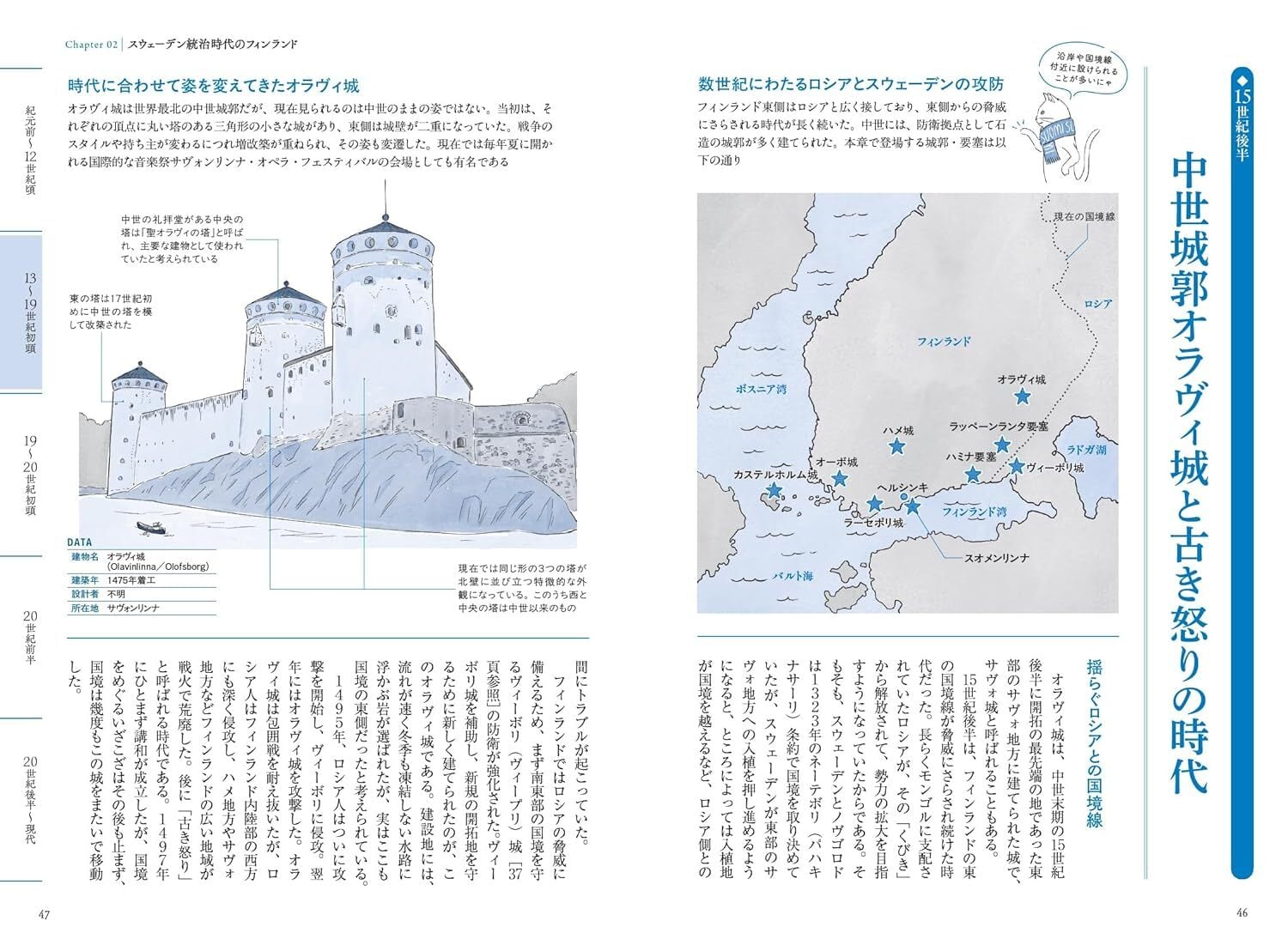 本書では、先史時代から現代にいたるまで、フィンランドの各時代を象徴する出来事や人物を、その舞台や背景となった建物と一緒に解説しています。