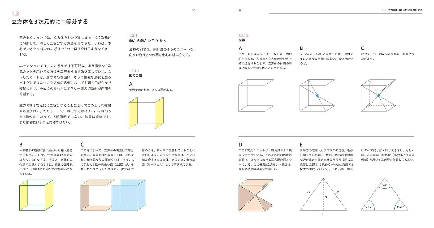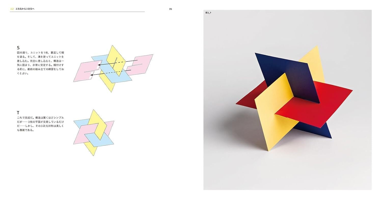 “私たちが生活しているのは3次元の世界だが、ほとんどのものは2次元の平面図や側面図をもとにデザインされている。本書で伝えるのは、3次元で思考してデザインする方法である。60もの制作プロジェクトを通じて、紙を折り曲げたユニットを組み合わせて、美しい立体構造を作りだす手法を学ぶ。3次元対称の原理を理解すれば、立体制作に取り組んでいる誰もが、新たな造形でデザインできるようになるだろう。そこには実用的で無限の創造性が秘められている”