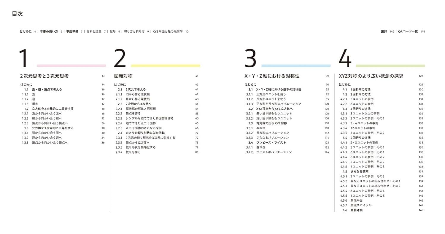約80点の写真と、手順についての300以上の丁寧な図解を収録。さらに、レッスンの一部(32作品)については、360度回転のショート動画(QRコード付き)を公開しています。数学的要素を省いたやさしい解説のため、小学生から大人まで、図形や幾何学・ものづくりに興味のある人に広くおすすめしたいガイドブックです。