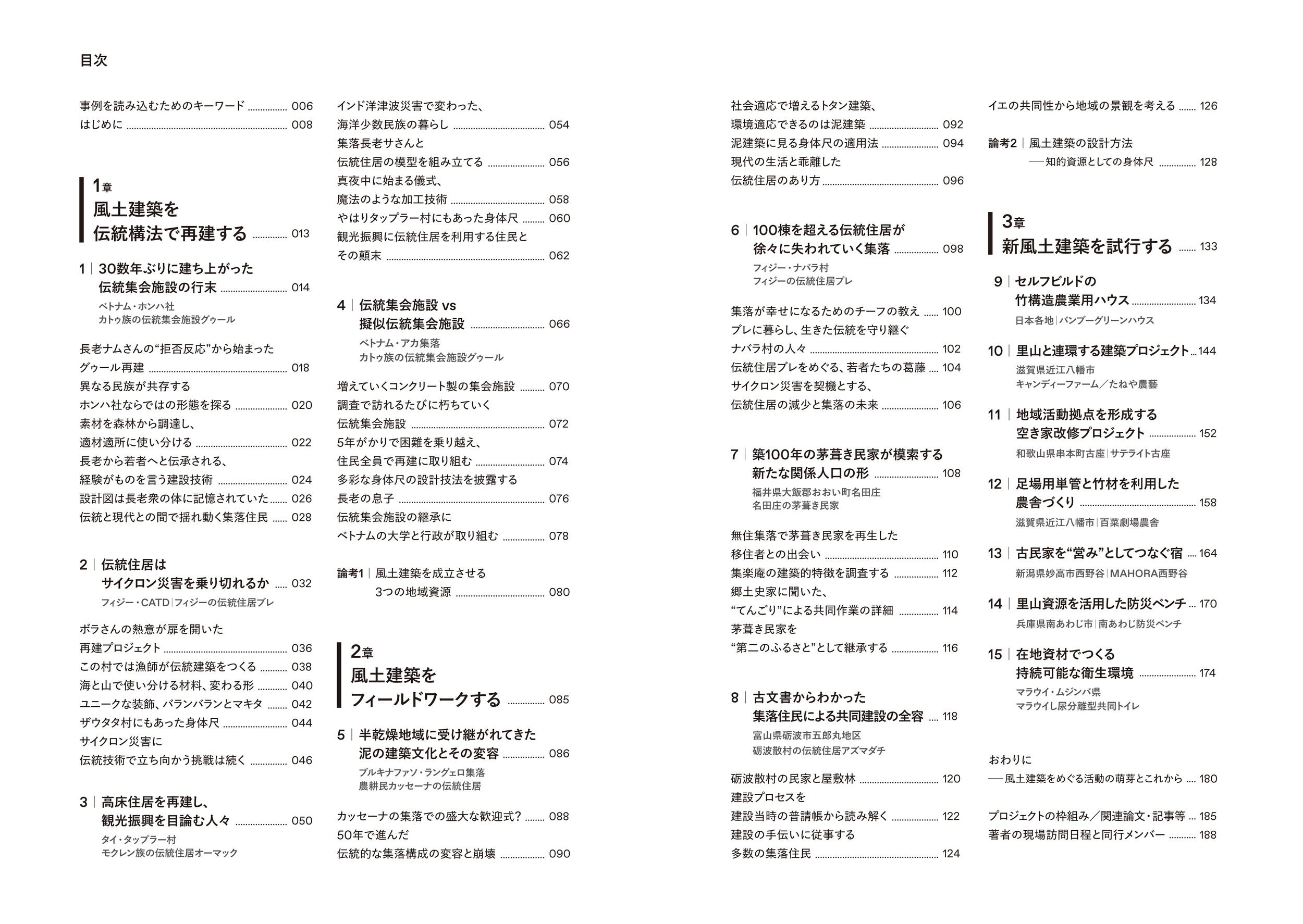 日本、アジア、南太平洋、アフリカにおける調査・再建・新作15プロジェクトのドキュメント。「地元の技術・材料・住民」という3つの地域資源にこだわる地域固有の建築は、無事に建ち上がり、使われ続けるか?近代化と伝統の間で揺れる集落の人々の姿は、グローバル化とローカリティの間で葛藤する都市住民にも示唆をくれる
