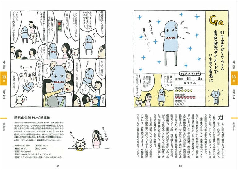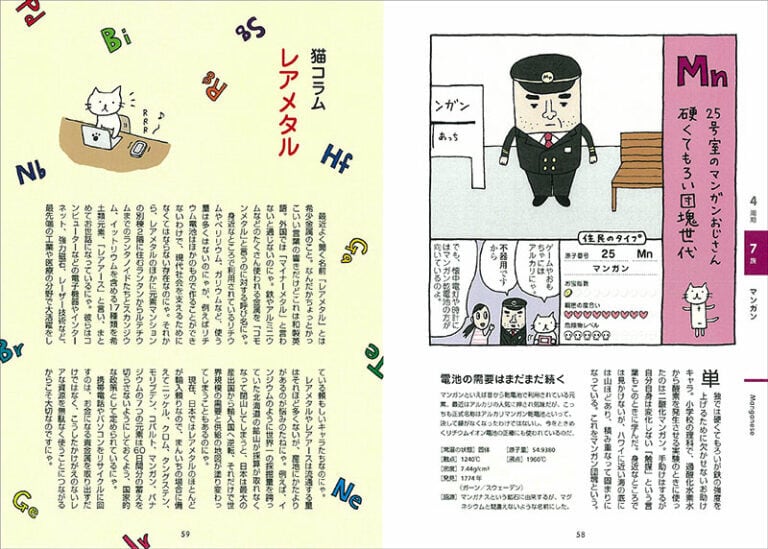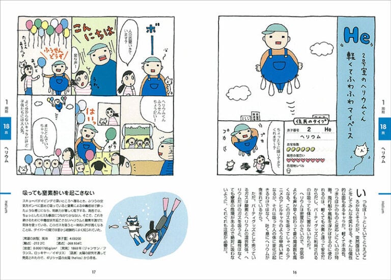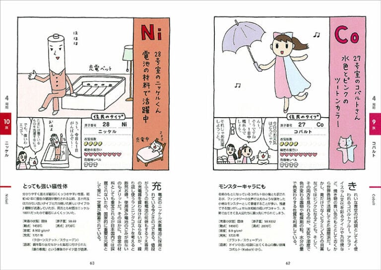 元素周期表をマンションに置き換え、その住人として元素をマンガによるキャラに仕立てました。1人1人個性的な元素キャラが見開きで登場し、その暮らしぶりを伝えることで、これだけは知っておきたいという特徴や構造、元素の相関関係、発見のエピソード、知っておきたいうんちくなどがずばりわかります。