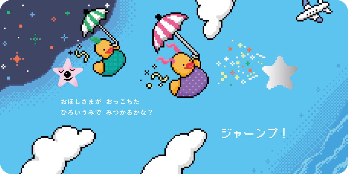 イラストレーター・サナエンビ初の絵本。カラフルでポップなドット絵の世界で始まる、仲良しあひるの双子によるちいさな大冒険。15センチ角の小さめでかわいいサイズ。ボードブックなので小さい子どもでも安心。穴あき加工やホログラム加工など楽しい工夫もたくさん。お子さんひとりでも、読み聞かせても楽しめます。